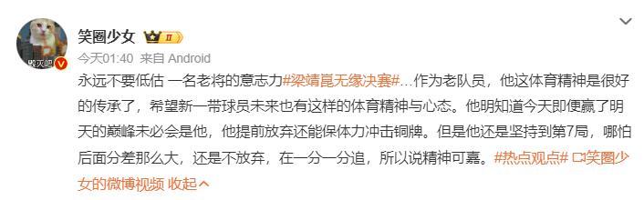 博主:永遠不要低估一名老將的意志力,梁靖崑的體育精神令人欽佩,他拿到了銅牌也消耗了雨果的體能。