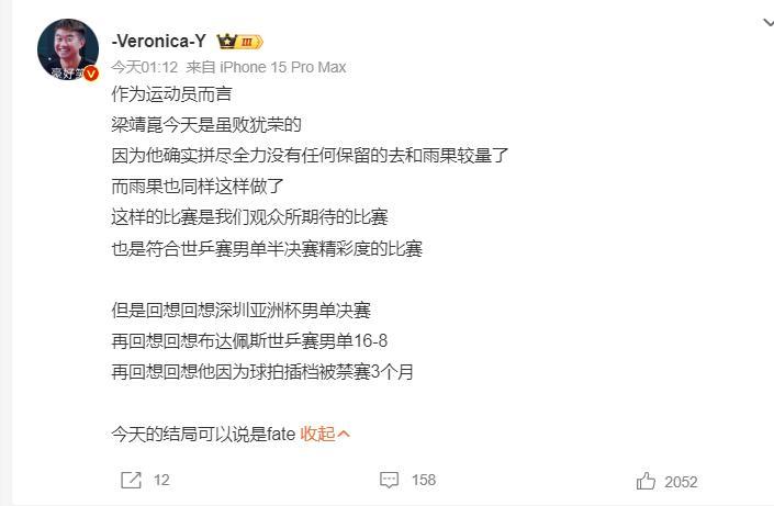 博主:作爲運動員而言此役梁靖崑雖敗猶榮,他拼盡全力沒有任何保留的跟雨果走啊站了,這是精彩絕倫的比賽。
