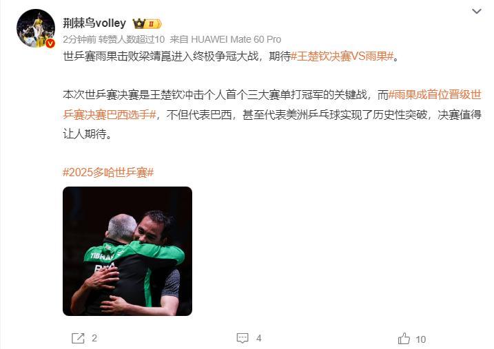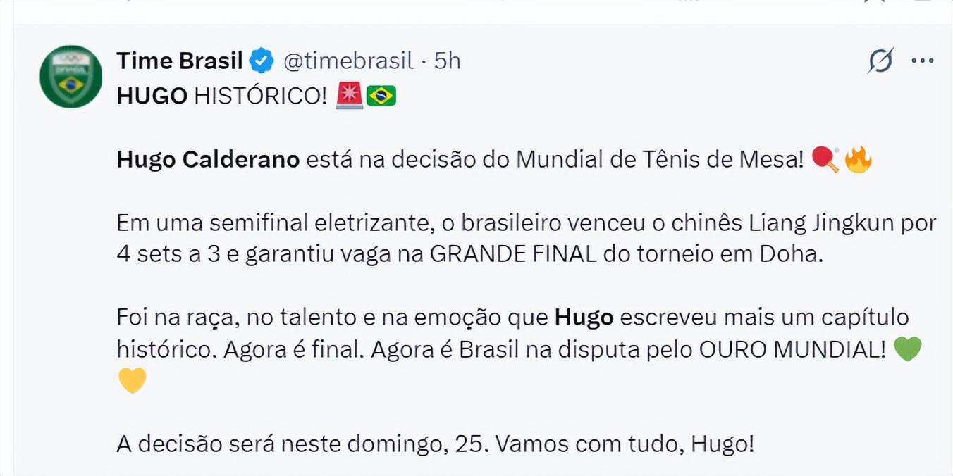 上個月的澳門世界盃雨果在男單決賽中擊敗林詩棟奪冠,他剛剛纔成爲了巴西乒壇、南美洲乒壇史上第一位拿到世界盃男單冠軍的選手,一個月後他又創造隊史首人紀錄,如果他決賽再贏球,那麼三大賽他就有兩個冠軍,也將衝擊生涯大滿貫。