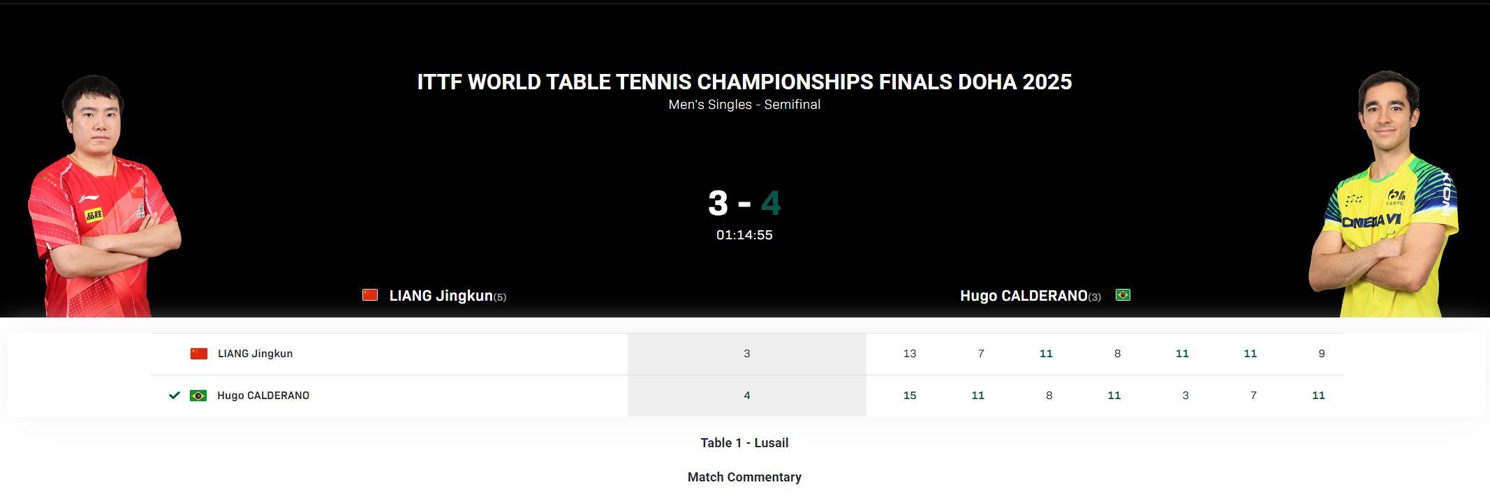 多哈世乒賽男單半決賽,中國選手梁靖崑3-4不敵巴西選手雨果無緣決賽,這場比賽雨果開場是2-0領先,隨後3-1領先,堅韌的大胖將比賽拖入搶七決勝局,只可惜決勝局雨果關鍵2分制勝拒絕大逆轉。
