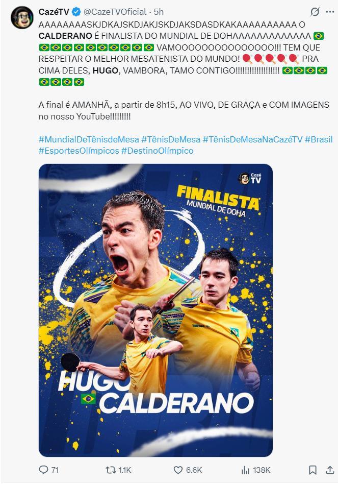 雨果再度創造了歷史,他成爲巴西乒壇史上第一位進入世乒賽決賽的選手,也是巴西乒壇史上首位鎖定世乒賽獎牌的選手。