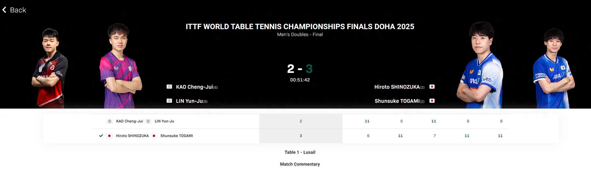 日本組合戶上隼輔/篠塚大登這邊的晉級之旅卻沒有太大波瀾,因爲他們的對手硬實力都不算太強,沒想到進入決賽戶上隼輔/篠塚大登迸發出了巨大的能量。首局6-11很快敗下陣來,第二局心態沒有任何波動完成扳平。