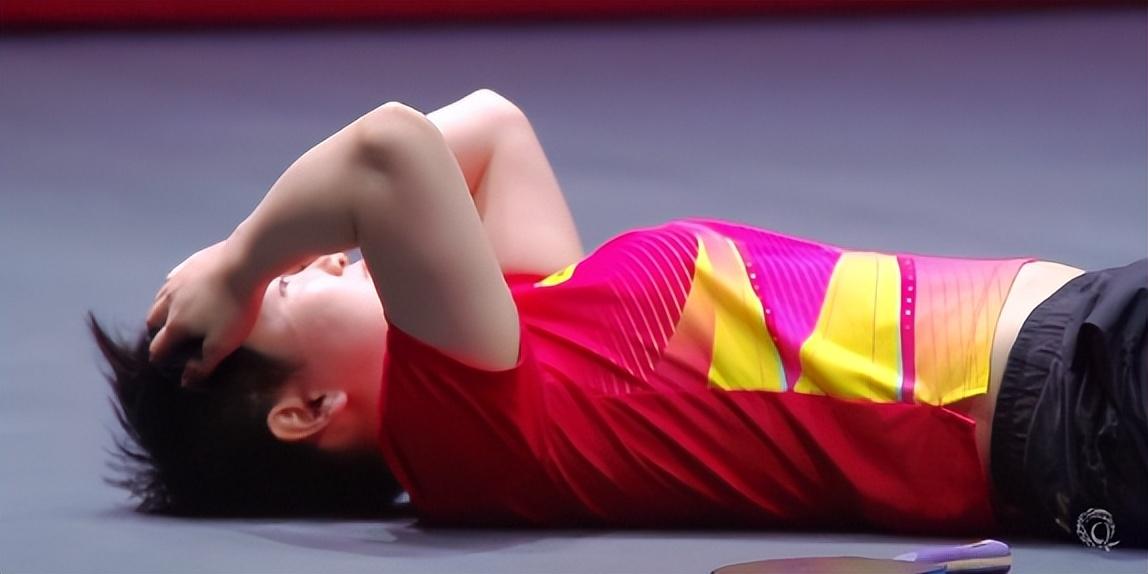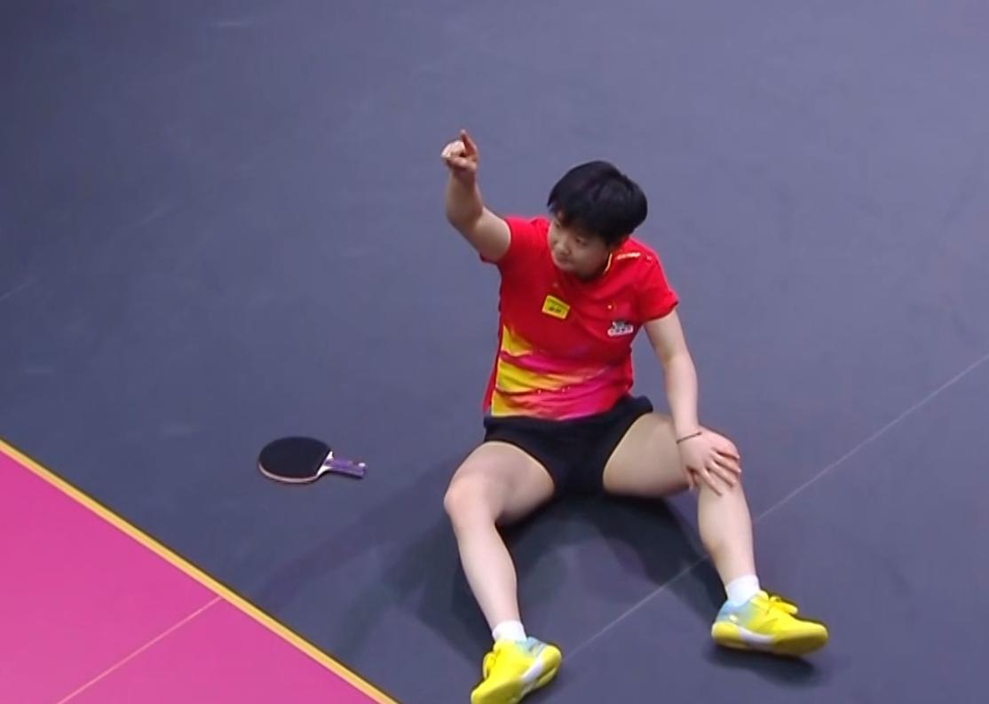 拿下勝利後孫穎莎釋放壓力了,她躺地慶祝,她捂着頭。