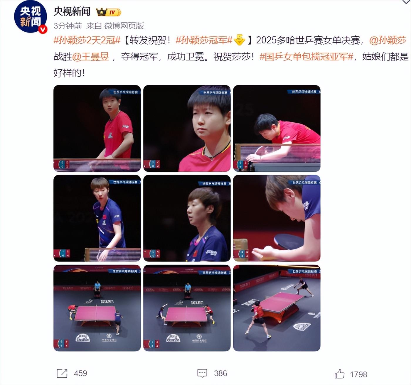 央視新聞立馬祝賀孫穎莎冠軍,衛冕成功,祝賀莎莎。