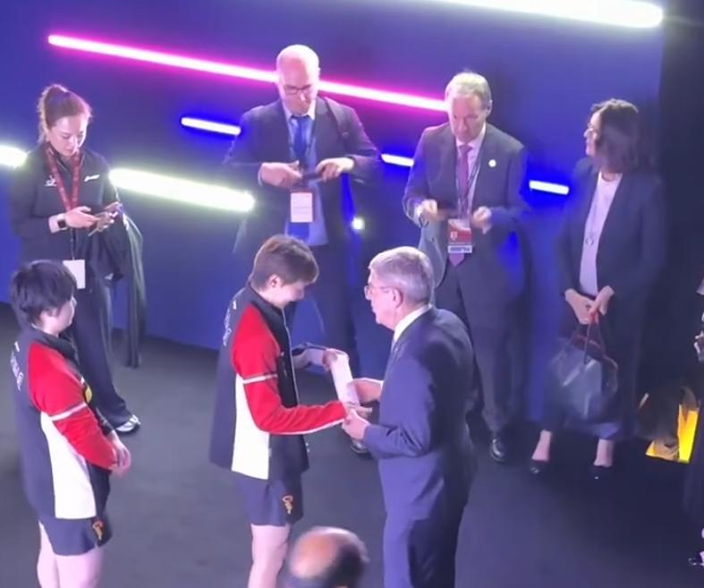 賽後巴赫也在球員通道等着王曼昱,他送上了自己爲王曼昱準備的小禮物,王曼昱收到禮物後露出了可愛的笑容。