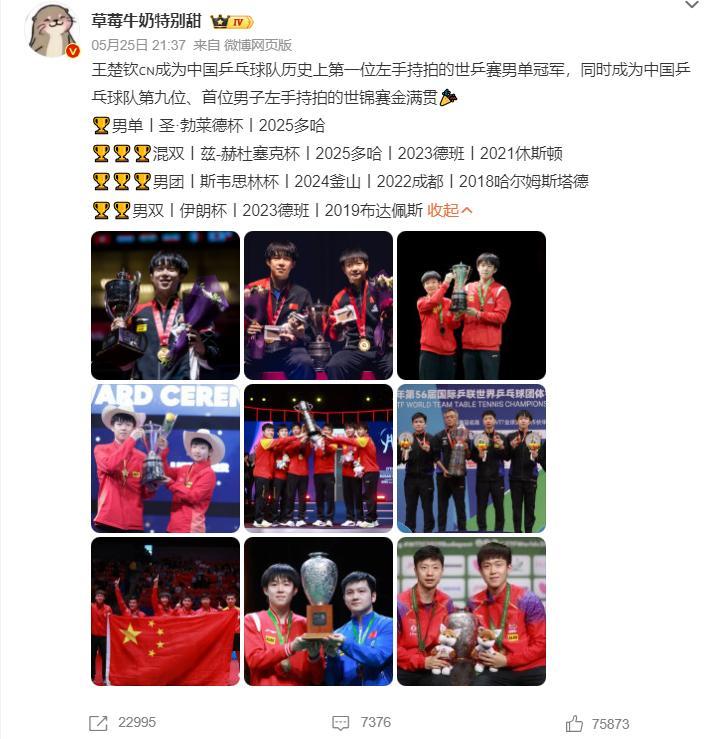 5.王楚欽爲中國乒乓球隊第九位世錦賽金滿貫;