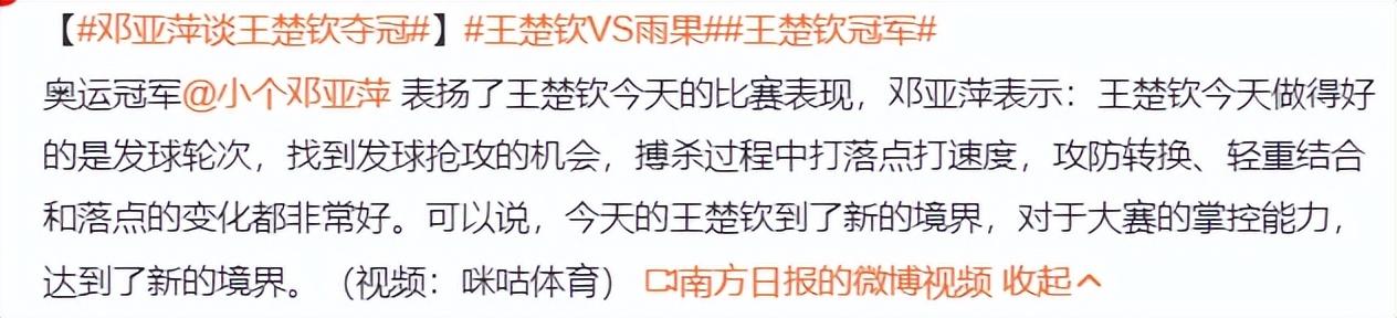 鄧亞萍還直言:王楚欽到了新的境界,對於大賽的掌控能力達到了新的高度。