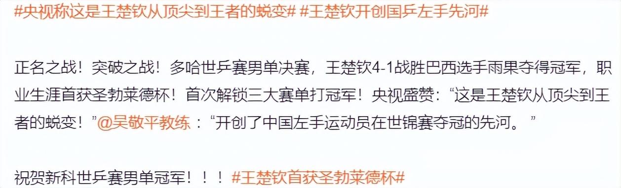 央視在直播間盛讚大頭:這是王楚欽從頂尖到王者的蛻變。吳敬平教練——開創了中國左手運動員在世錦賽奪冠的先河。