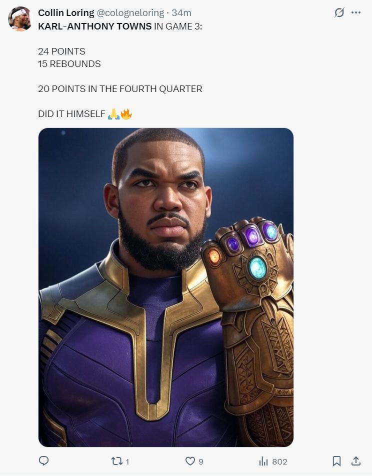 紐約媒體PS唐斯是滅霸的圖片盛讚他,這是屬於唐斯的夜晚,也很感謝他。