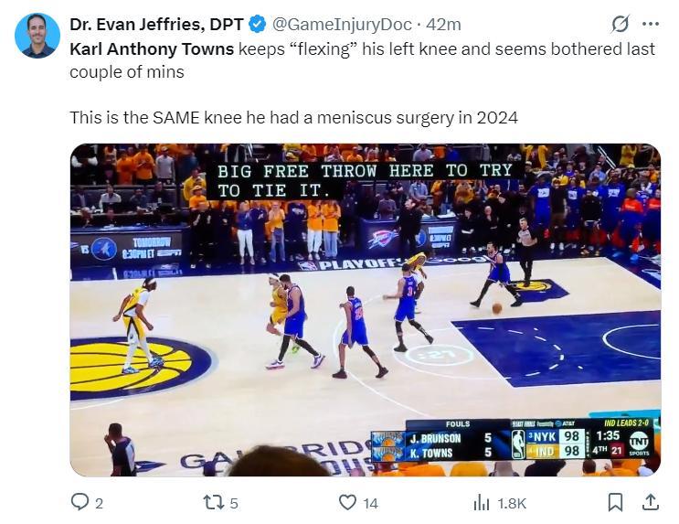 不過醫學專家埃文-傑弗里斯曬出末節還剩1分35秒唐斯在場上一瘸一拐的瞬間,他寫道:“KAT不停地活動自己的左膝,最後幾分鐘看起來他的左膝很不舒服,他在2024年時接受過左膝半月板修復手術。”(如果唐斯的膝蓋再度發生傷病,那麼尼克斯被淘汰就是時間問題,希望KAT的左膝沒有大礙吧)