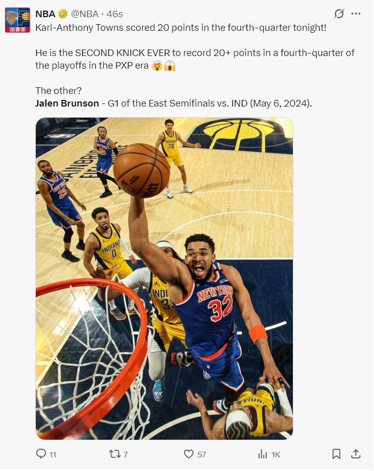 唐斯此役也成爲尼克斯隊史布倫森後第二位在季後賽拿到末節20+的球員,布倫森在2024年東部半決賽G1末節拿過20分。