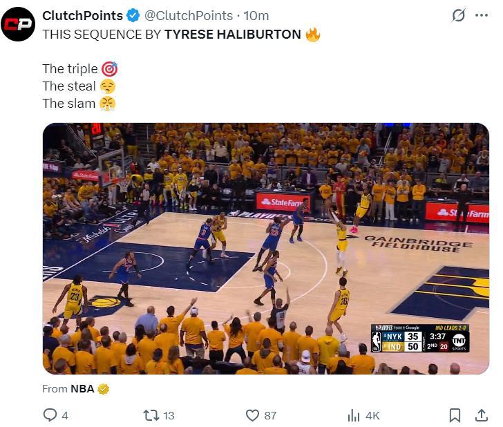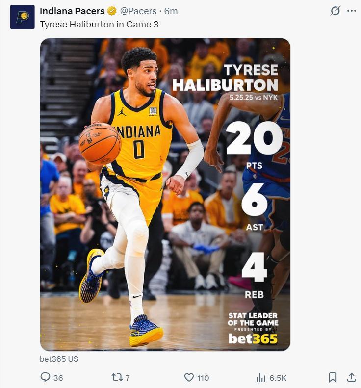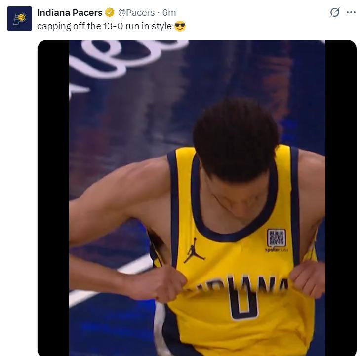 哈利伯頓在首節4分2籃板2助攻不溫不火,他在第二節後半段大爆發,一個急停的三分球將分差拉開到18分。