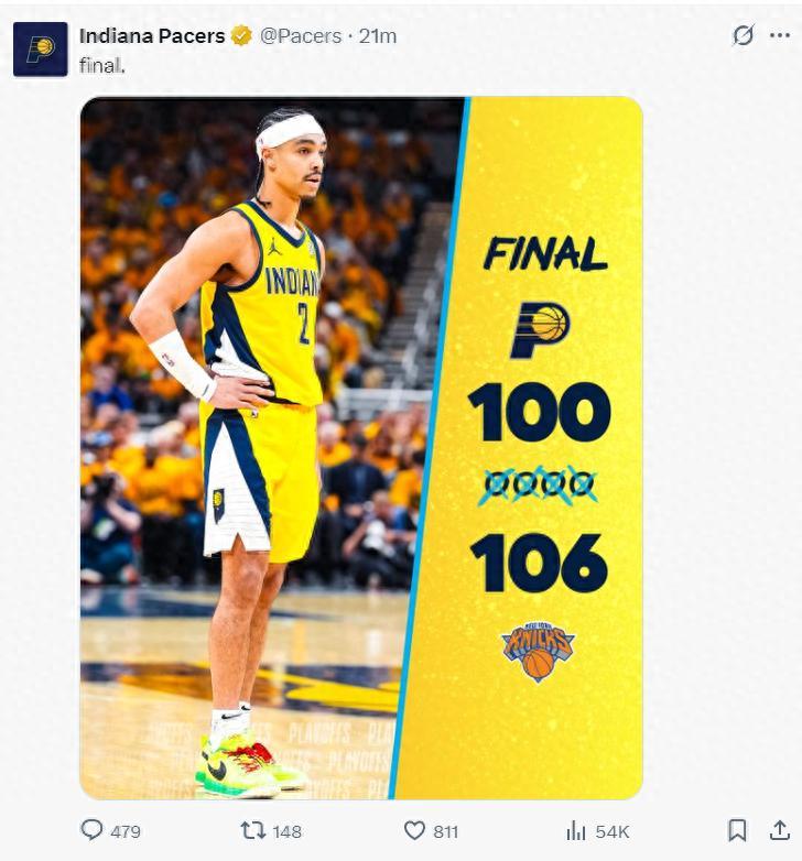 北京時間5月26日,步行者以100-106被尼克斯逆轉,大比分被扳成1-2。這場比賽步行者主場一度領先多達20分,沒想到下半場尼克斯完成了逆轉,末節讓唐斯20+8統治內線,決勝時刻西卡三分不中比賽走向完結。哈利伯頓與西卡都空砍。
