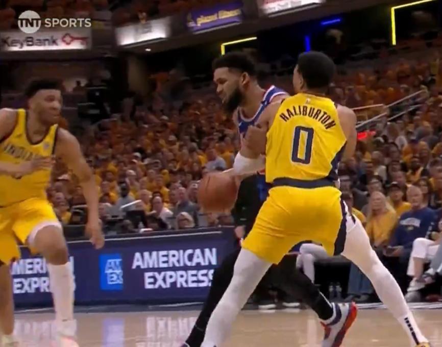哈利伯頓被吹阻擋唐斯2+1,卡萊爾直接挑戰唐斯故意夾臂成功,唐斯喫下第三次犯規。