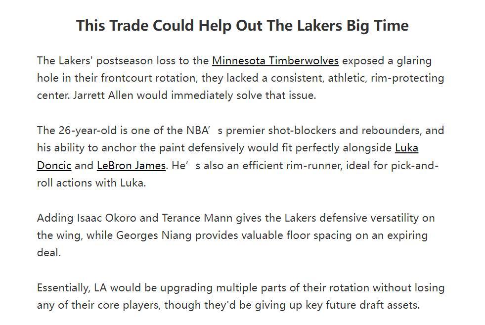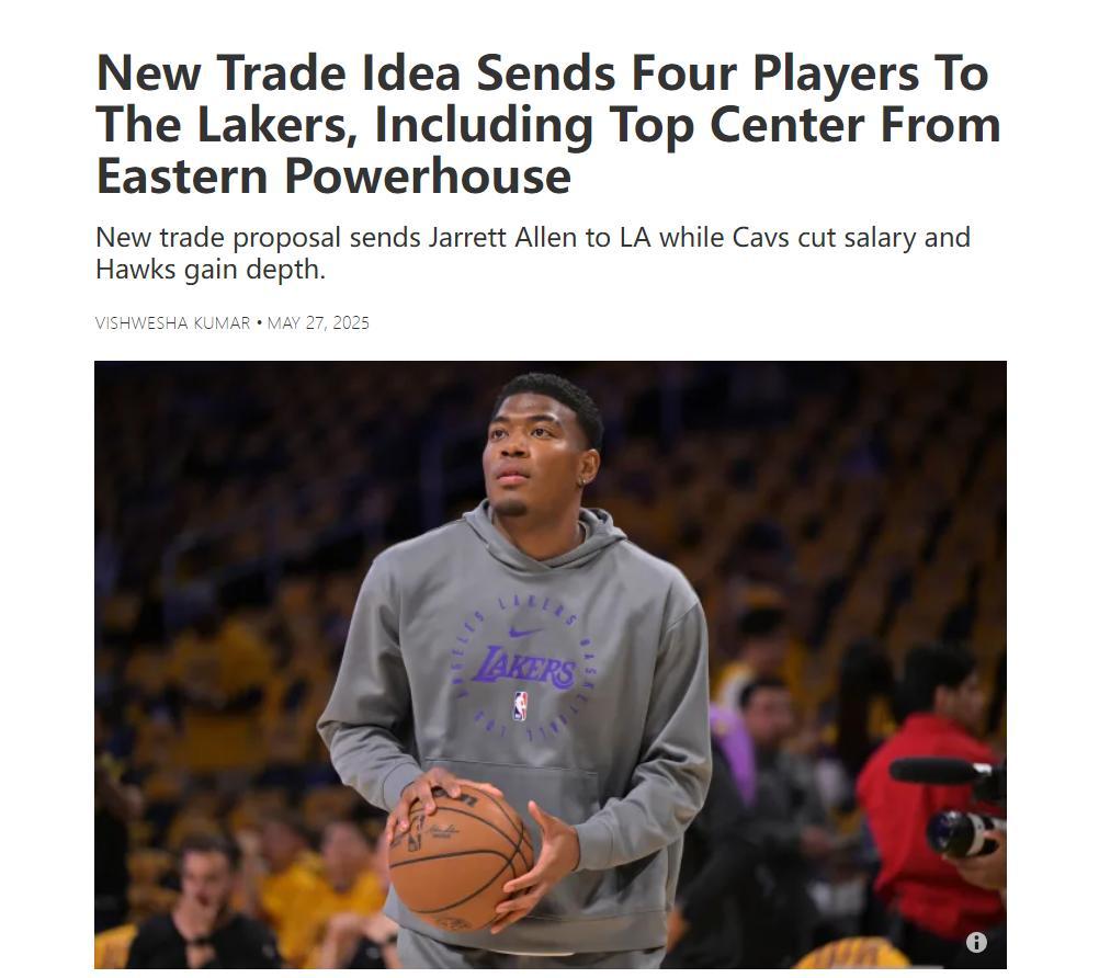 北京時間5月27日晚,美媒FW爲湖人指明瞭補強五號位的方向——賈萊特-阿倫,但這次並不是用勒布朗換,而是一筆三方大交易,佩林卡得梭哈。