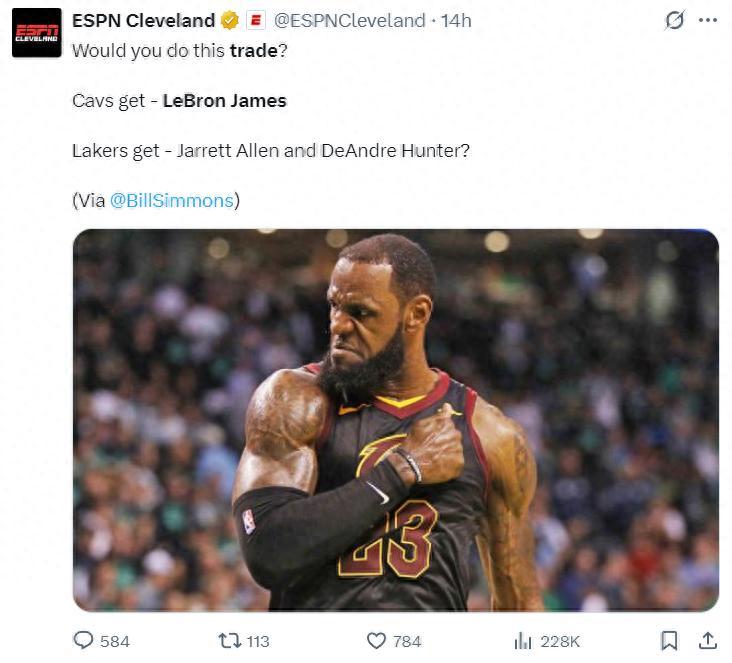 實際上過去三年比爾-西蒙斯多次建議詹姆斯被換回克利夫蘭,他希望勒布朗生涯的最後一年在課程度過,但LAL怎麼可能放走勒布朗這個“搖錢樹”?勒布朗就是票房與曝光率的保證,珍妮-巴斯沒有其他資產,一大家子都指着湖人賺錢呢。