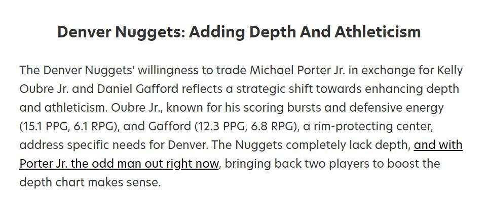 小波特在掘金的陣容中存在感逐漸走低,而且小球市掘金也已經不堪重負,球隊一直想爲約基奇找到一個合適的五號位輪替,加福德是一個不錯的選擇,烏佈雷有了約基奇的幫扶也會更加高效。