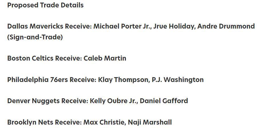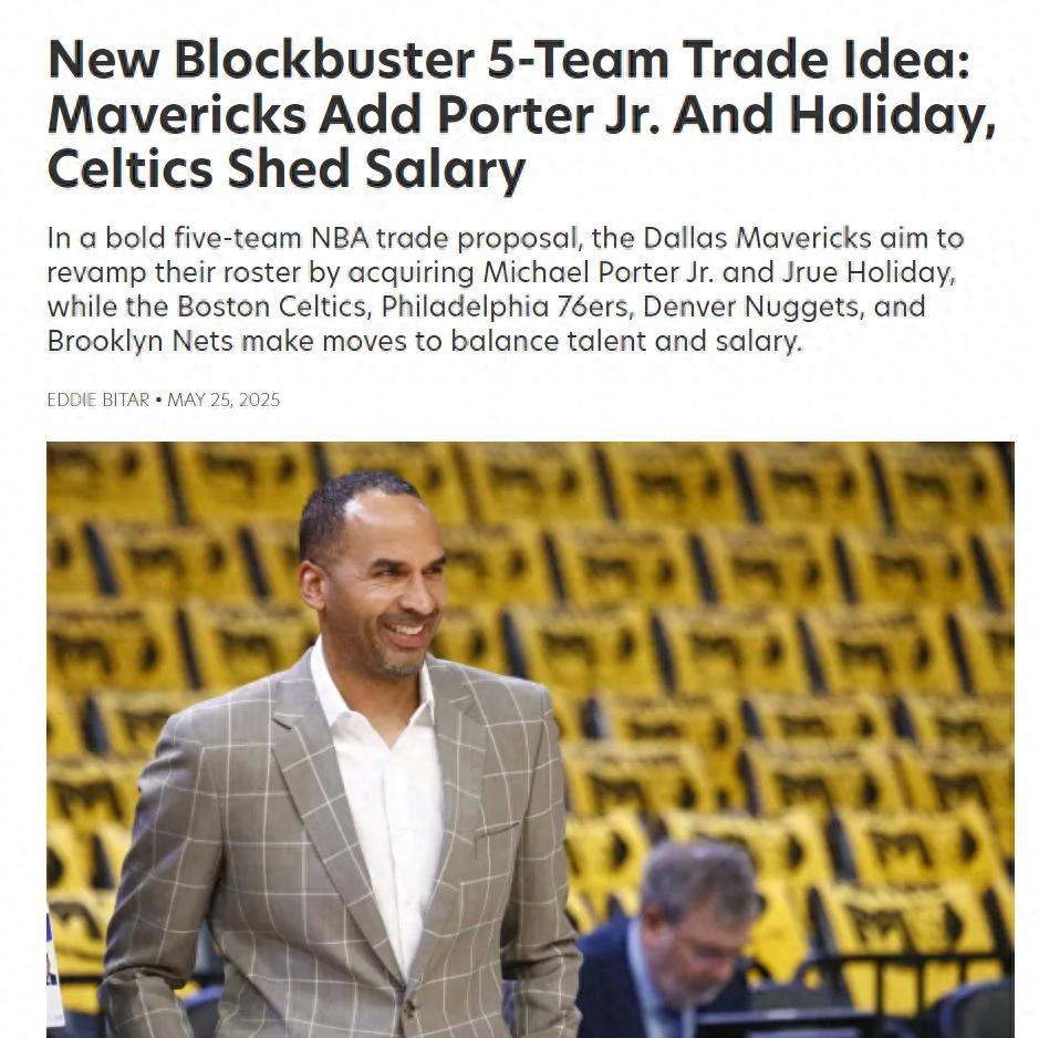 近日,美國媒體FW建議五方大交易——凱爾特人、獨行俠、籃網、掘金、費城,在這筆大膽的交易提案中,獨行俠得到了波特+朱哥,綠凱、費城、掘金、籃網則得到自己需要的人才,凱爾特人也能減稅平衡支出。