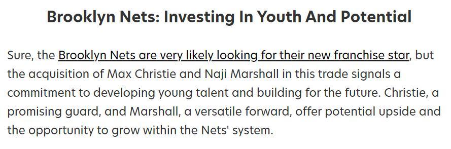 籃網得到多才多藝的年輕資產克里斯蒂,馬紹爾也是一位即戰力,籃網可以爲後續的交易做準備。