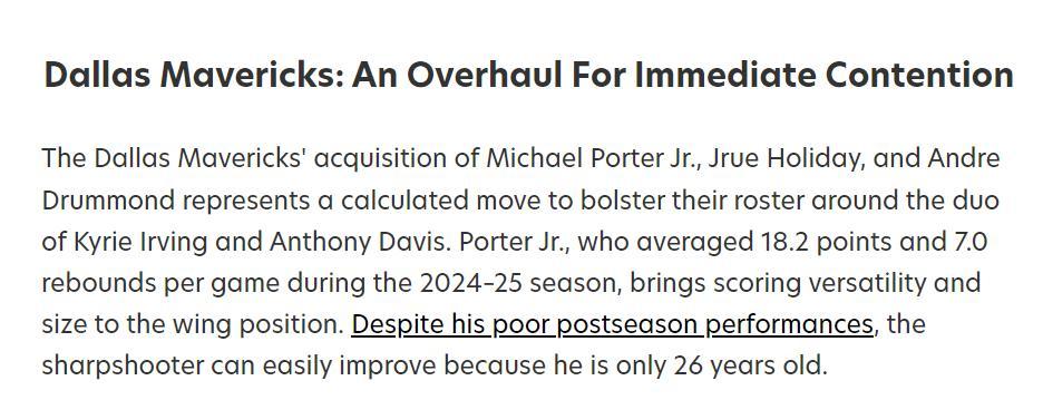 FW寫道:得到霍勒迪可以增加獨行俠外線防守,他們休賽期的目標也是找到歐文先發一號位的替身;小波特的加盟也能增加這支球隊的得分能力,德拉蒙德的到來可以彌補加福德得出走,歐文、戴維斯、弗拉格身邊的陣容更完備。