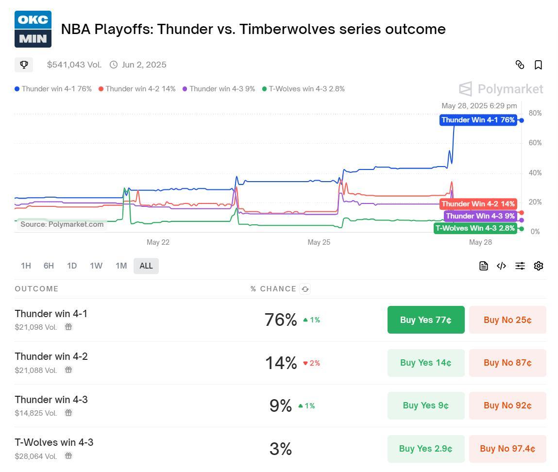 森林狼這邊就截然不同了,Polymarket預測,森林狼4-3逆轉雷霆的概率只剩下2.8%,雷霆晉級的概率已經高達97.2%。