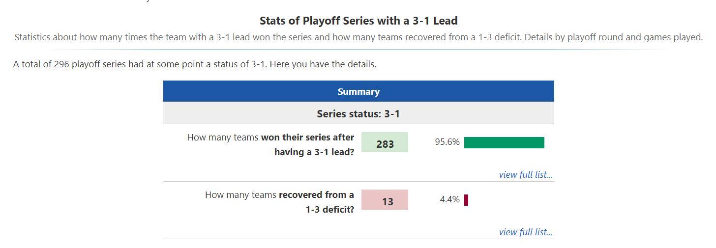縱觀NBA歷史,3-1領先的球隊最終是283隊晉級只有13隊被逆轉,換言之步行者、雷霆晉級概率高達95.6%,森林狼與尼克斯逆襲概率僅爲4.4%。