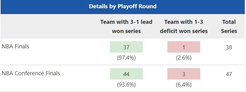 NBA歷史分區決賽3-1領先的有47隊,僅3隊完成過逆襲,逆襲概率也只有6.4%,有44隊都成功晉級,晉級概率93.6%。
