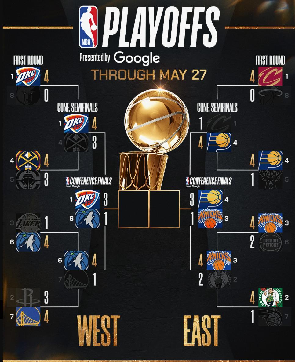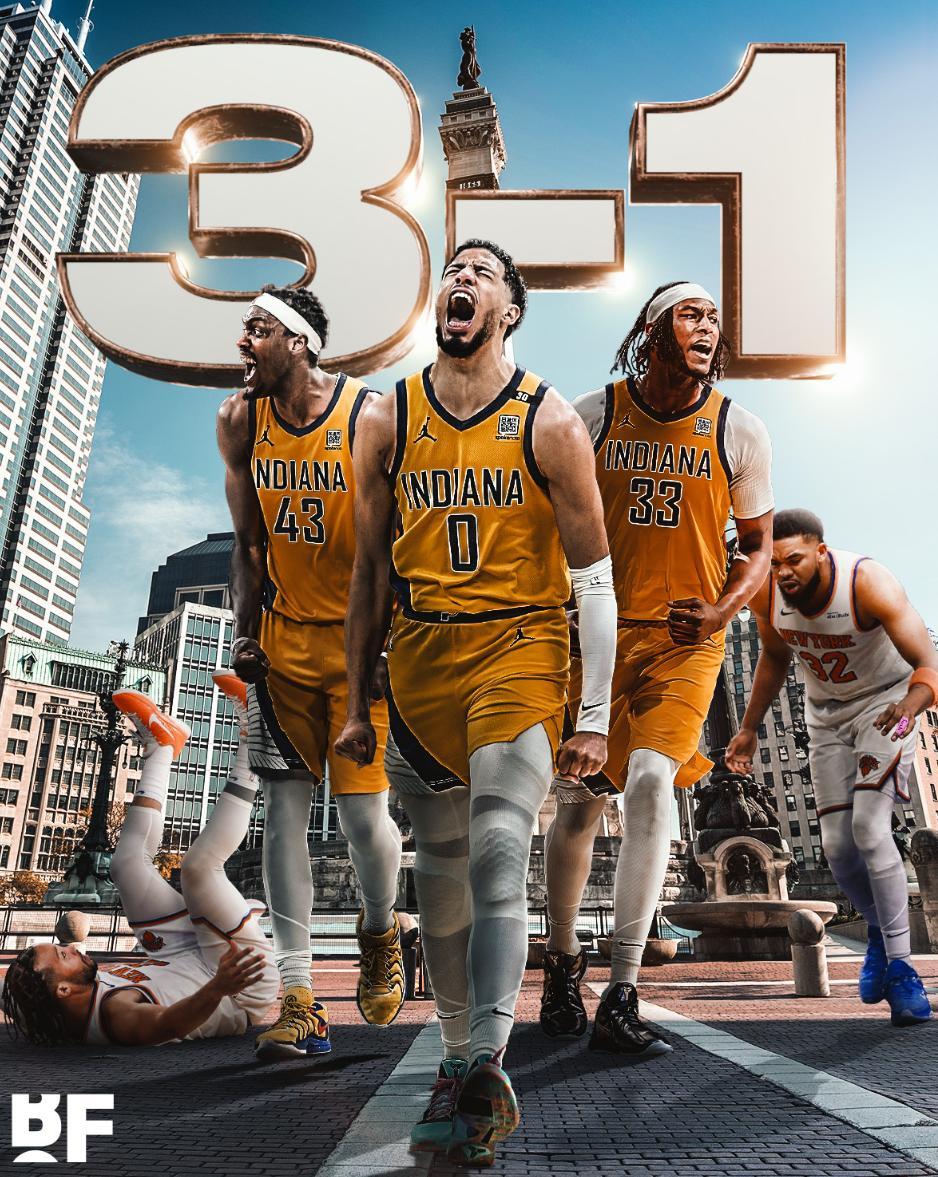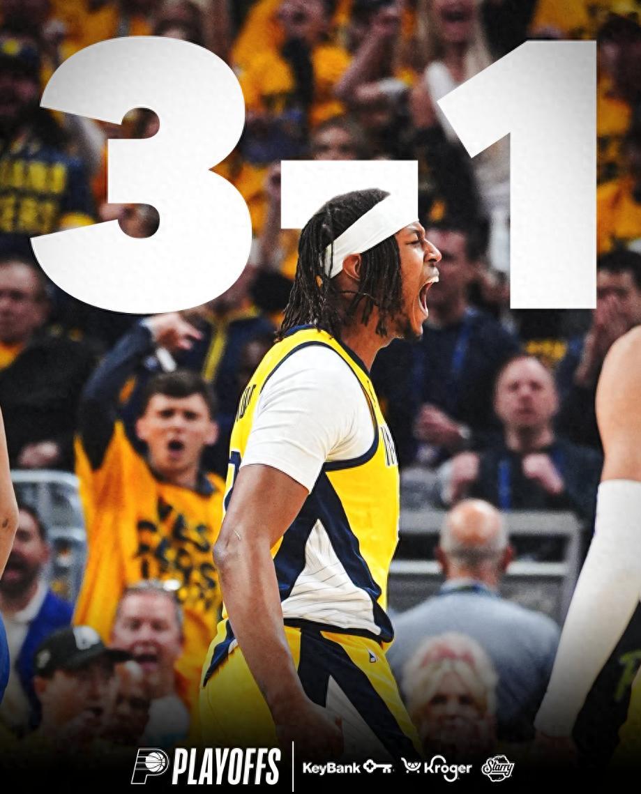 印第安納步行者3-1領先紐約尼克斯,這樣一來東決與西決都是3-1,不同的是東決是沒有主場優勢的步行者3-1領先,西決是手握主場優勢的雷霆3-1領先。