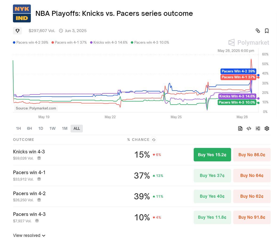 但是兩大預測美媒對尼克斯、森林狼兩支大比分落後球隊的預測逆襲概率有較大的出入,比如Polymarket預測,尼克斯4-3逆轉步行者的概率還剩14.6%,步行者晉級概率85.4%。