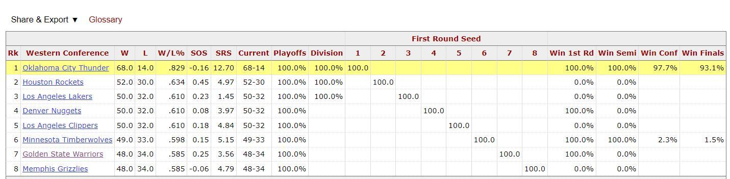 西部兩隊的晉級歷程:森林狼4-1湖人、森林狼4-1勇士;雷霆4-0灰熊、雷霆4-3掘金;
