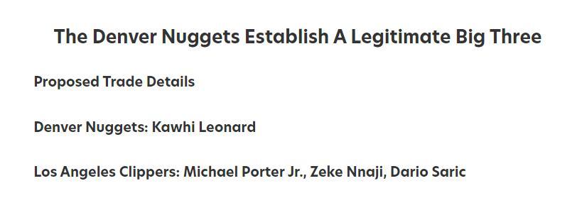 第一支是丹佛掘金,季後賽小卡與掘金大戰7場,場均25+7.6+4.7+1.14+0.71+命中率53.7%+三分命中率40.5%,小卡雖然沒有那種超巨接管能力但他的穩定性遠超小波特。掘金願意以小波特+納吉+薩里奇換倫納德,組成約基奇+穆雷+倫納德+戈登的新三巨頭。