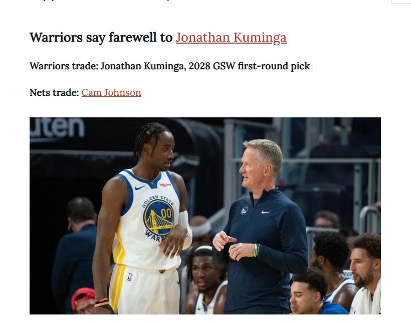 第一筆交易就是送出庫明加、2028年首輪簽得到卡梅倫-約翰遜,庫明加需要先簽後換。因爲庫明加不適合科爾的傳切體系,他也不願意努力防守,打球的體質與球隊不符,而卡約不同,身高6尺8的卡約有出色的投射能力與傳導球能力,卡約還是一個頂級的防守側翼,他完美契合勇士體系,不佔用球權深得科爾之心。