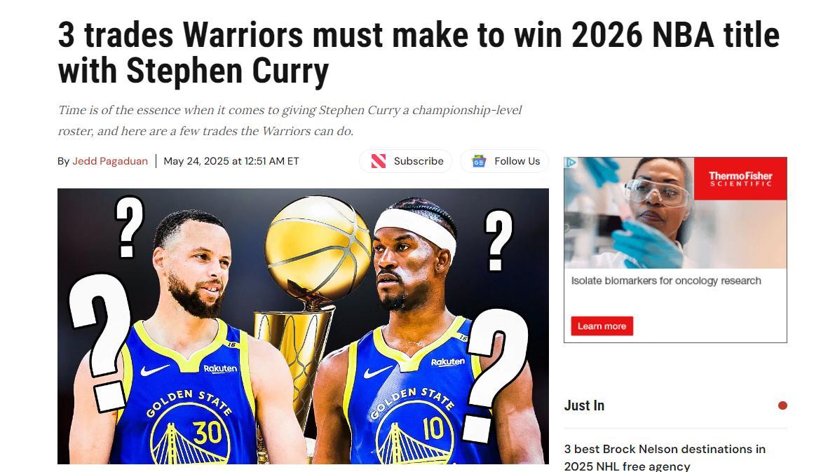 近日美媒Clutchpoints模擬了三套交易方案,他們認爲如果勇士完成這三筆交易(完成其中一筆即可)將在2026年奪得NBA總冠軍,庫裏將完成職業生涯第五個總冠軍,庫裏將藉此進入歷史前五之列。