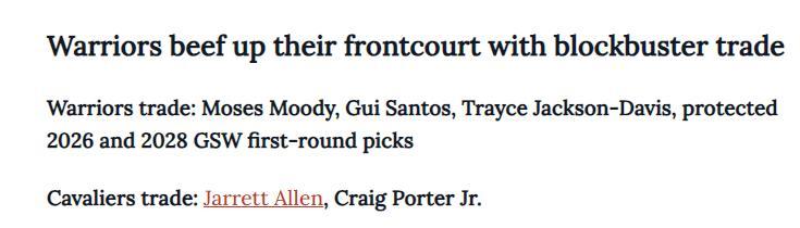第二筆交易是用穆迪、桑托斯、戴維斯、2026年首輪、2028年首輪從騎士換來賈萊特0阿倫、小克雷波特。這筆交易勇士補強了最弱一環五號位,科爾雖然喜歡用死亡五小,可他也深知有一個頂級的喫餅內線+護框內線多麼重要,如果阿倫能來到勇士,這支勇士的防守有希望成爲聯盟前三。