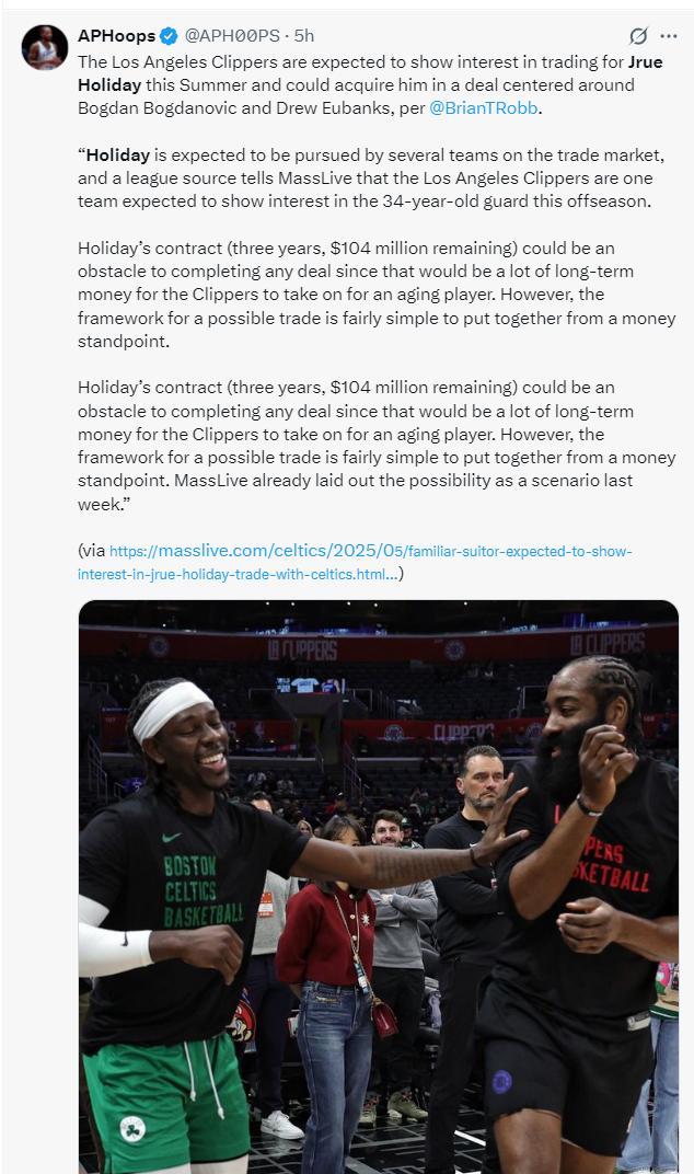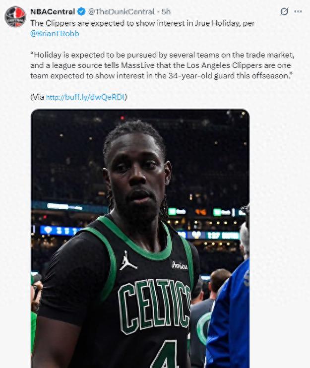 北京時間5月29日,NBA記者Brian Trobb報道,預計休賽期洛杉磯快船會對凱爾特人後衛朱-霍勒迪感興趣,LAC也是聯盟對霍勒迪最感興趣的球隊,綠凱需要一些到期合同來爲他們未來減稅。