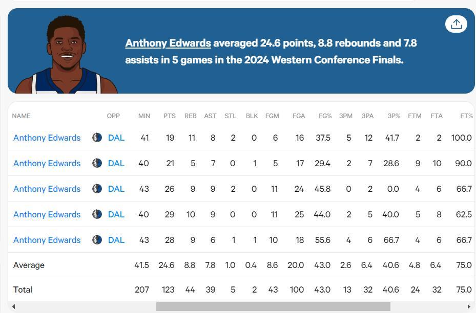 2024年獨行俠西決5場,愛德華茲場均41.5分鐘,拿到24.6分8.8籃板7.8助攻1搶斷0.4蓋帽3.4失誤,命中率43%,三分命中率40.6%,這樣的表現其實挺拉胯的。