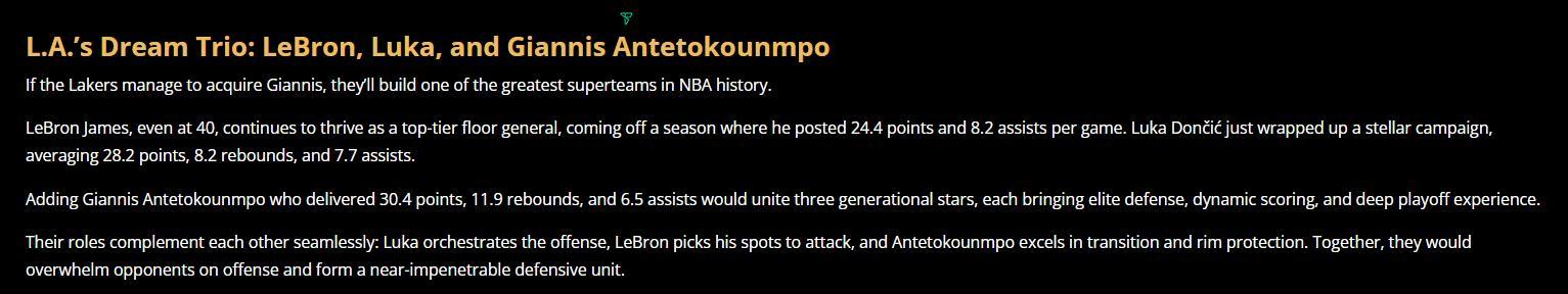 最終湖人組成詹姆斯、東契奇、揚尼斯的夢幻三巨頭,詹姆斯本賽季場均24.4分8.2助攻東契奇本賽季28.2分8.2籃板7.7助攻,揚尼斯場均30.4分11.9籃板6.5助攻這三人都會入選全明星陣容+最佳陣容,湖人會直接成爲西部前三的超級球隊。