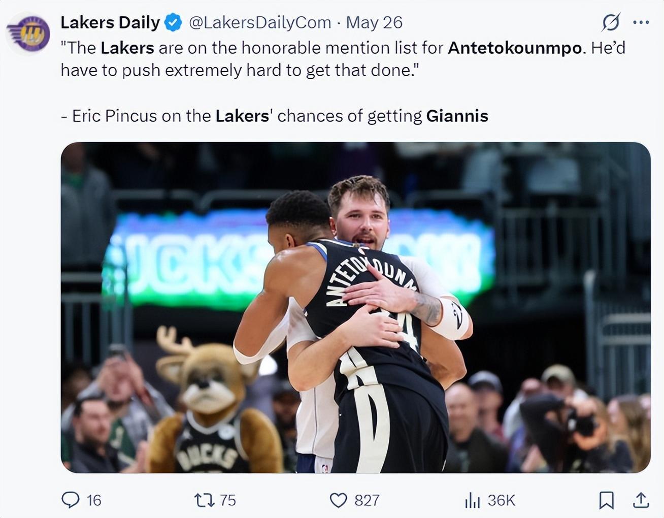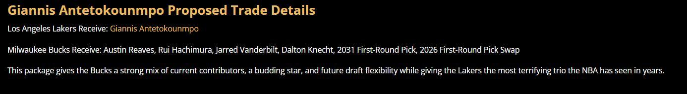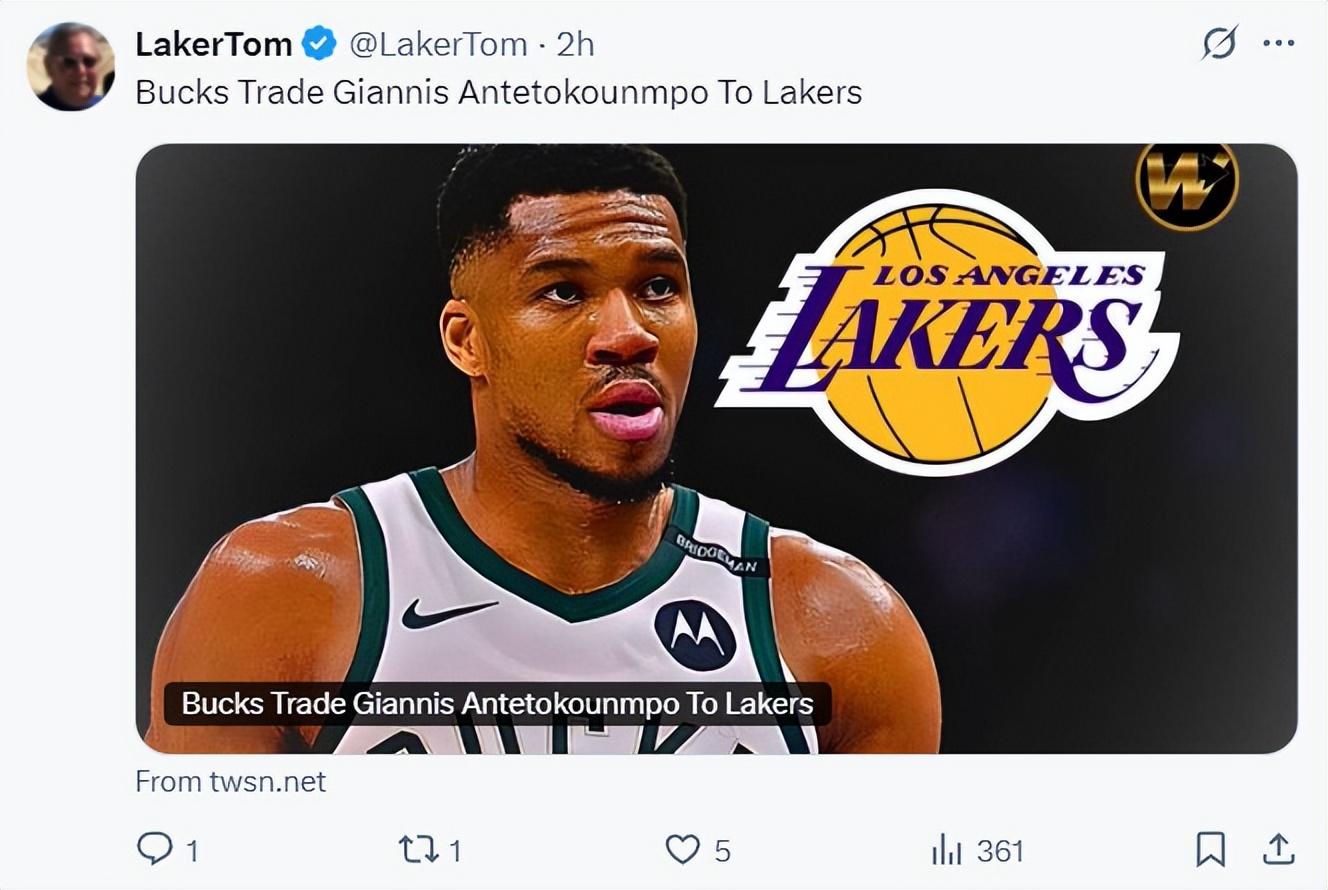 隨後湖人媒體Laker Tom重提了那筆交易方案——將揚尼斯-阿德託昆博換來LAL。