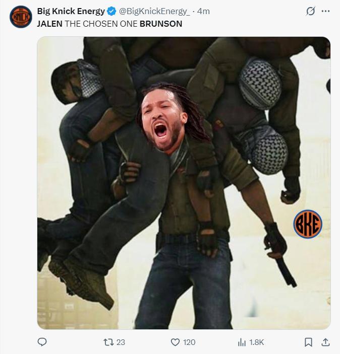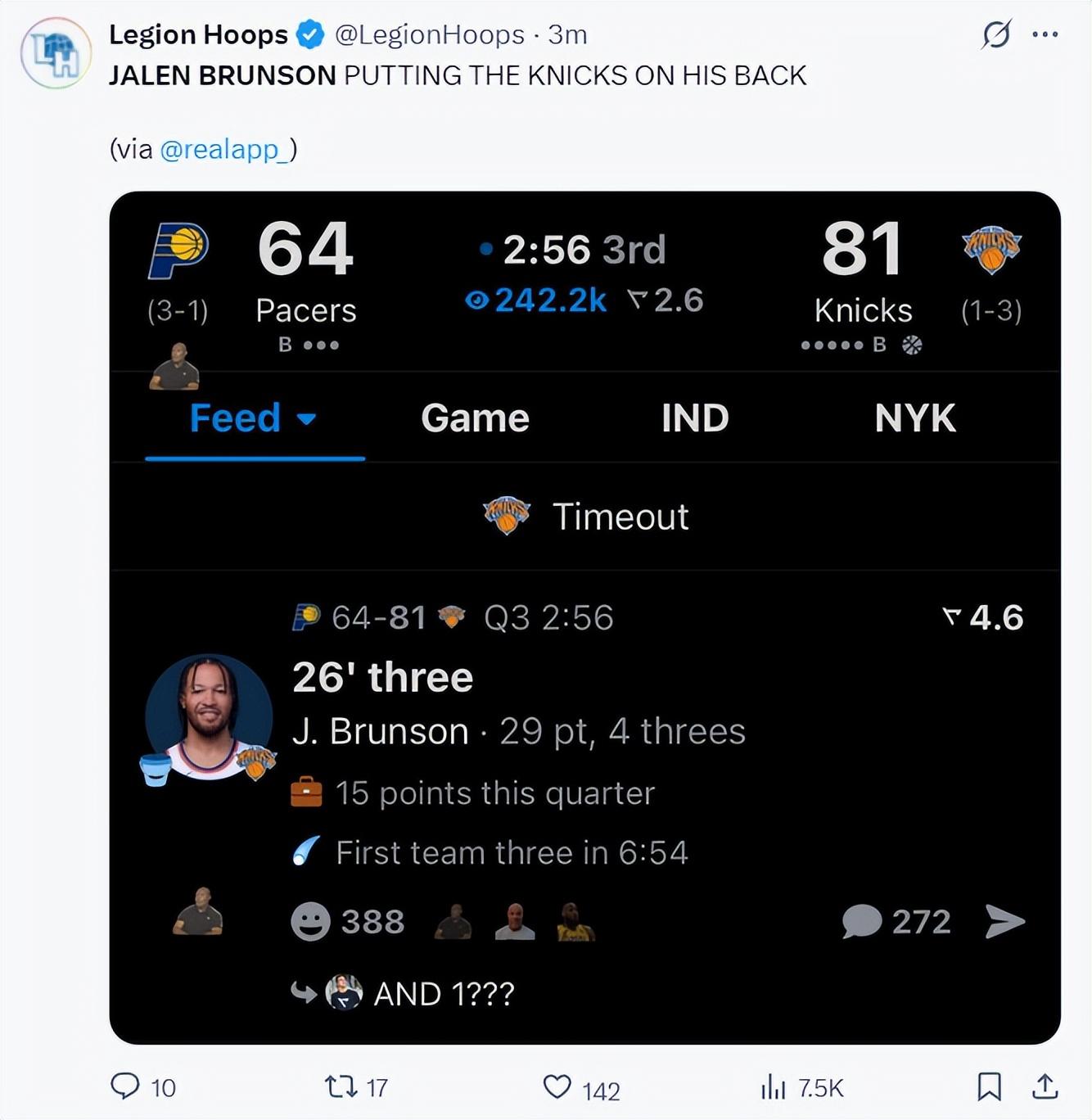 末節開場布倫森還在休息,尼克斯被縮小到12分,布倫森被換上,布倫森急停命中,隨後卡萊爾放棄比賽,布倫森也被換下,布倫森全場比賽33分鐘,18中12+三分7中4拿到32分5籃板5助攻。