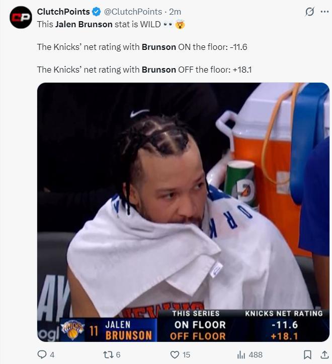 但官方給到布倫森的數據,當布倫森在場時尼克斯-11.6,當布倫森不在場時尼克斯+18.1,換言之布倫森只要登場就是輸分,而他下場唐斯單獨帶隊時尼克斯表現更好。