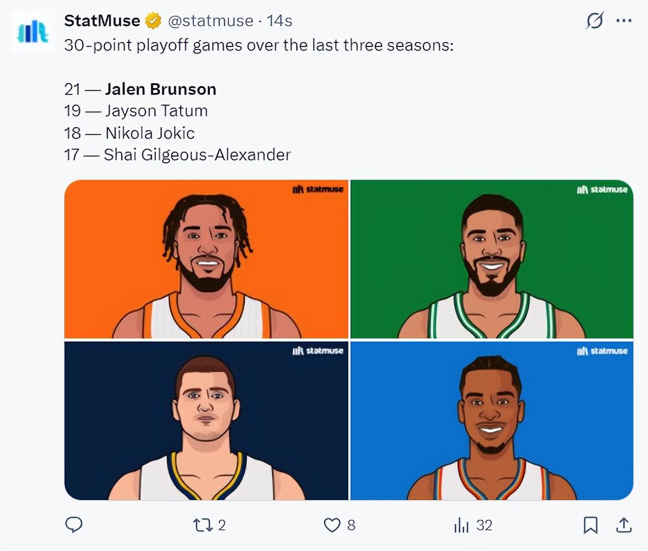 過去三個賽季季後賽30+次數,布倫森已經21次聯盟第一,排在第二的是塔圖姆19次。