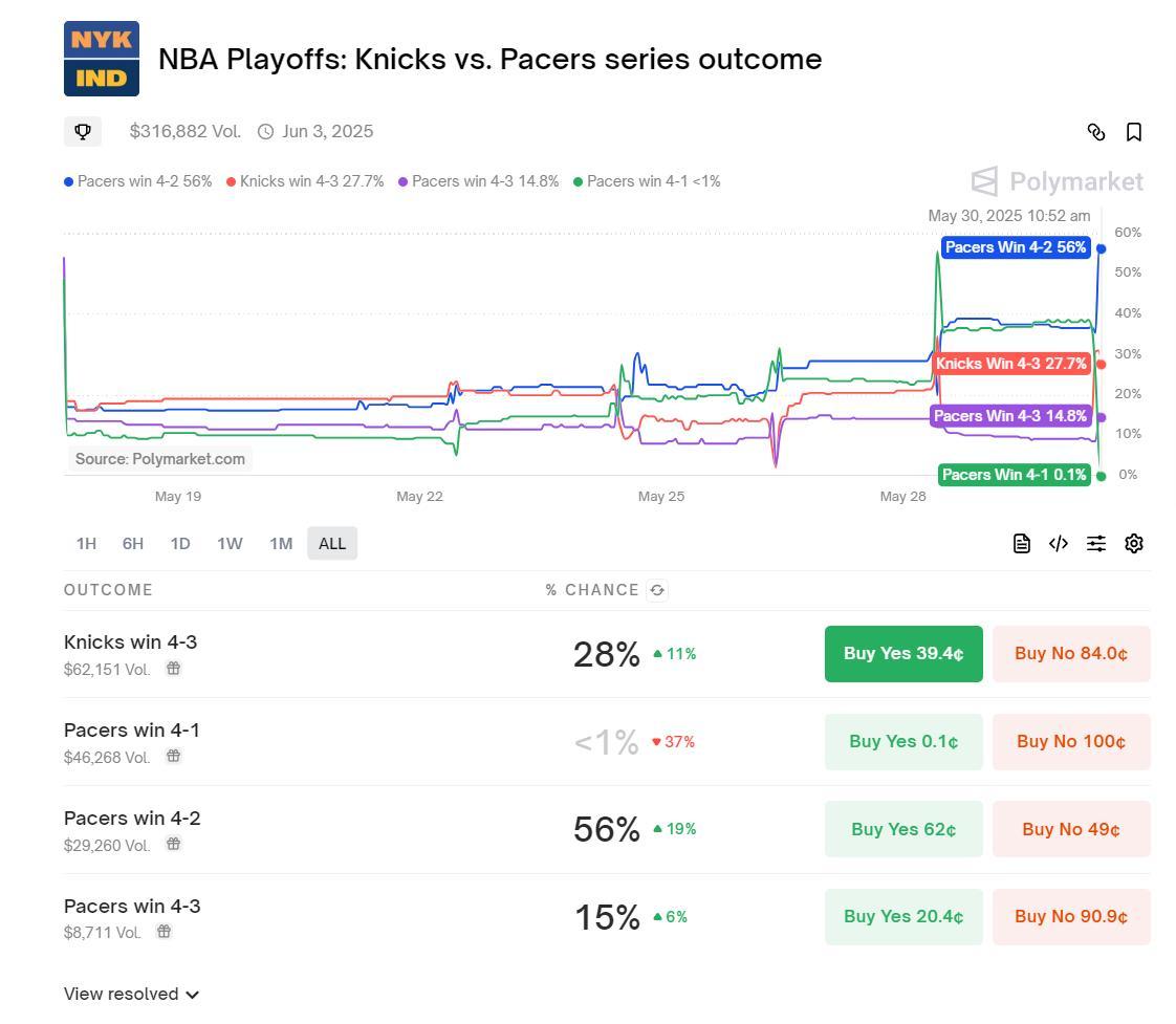 數據媒體Polymarket也更新了尼克斯的逆襲概率,尼克斯搶七晉級總決賽的概率升至27.7%(接近28%)。感覺尼克斯真的還有一點點希望,因爲此前1-3落後逆襲概率只有4.4%。