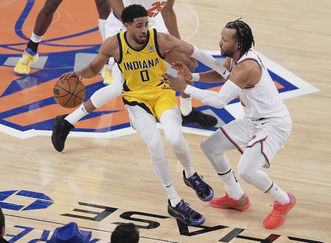 賽前喬治在個人播客中說“在我心目中哈利伯頓就是超級巨星”。哈利伯頓在G4一戰拿到32分15助攻12籃板3搶斷0失誤的狂暴數據,那麼這場G5尼克斯的取勝之匙就是要限制哈利魔法的個人發揮。錫伯杜開場就是讓布里奇斯、阿奴諾比兩人中輪番貼着哈利伯頓,首節哈利伯頓打了足足10分鐘2中0拿2分1籃板1助攻。
