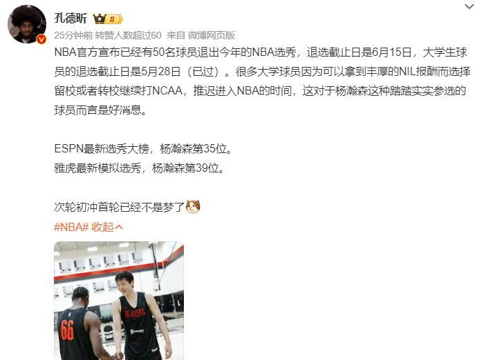 孔德昕也認爲楊瀚森次輪初衝首輪已經不是夢,楊瀚森受益於NIL報酬選擇留校或轉校繼續打NCAA推遲進入NBA的時間,這讓他的競爭一下小了不少。