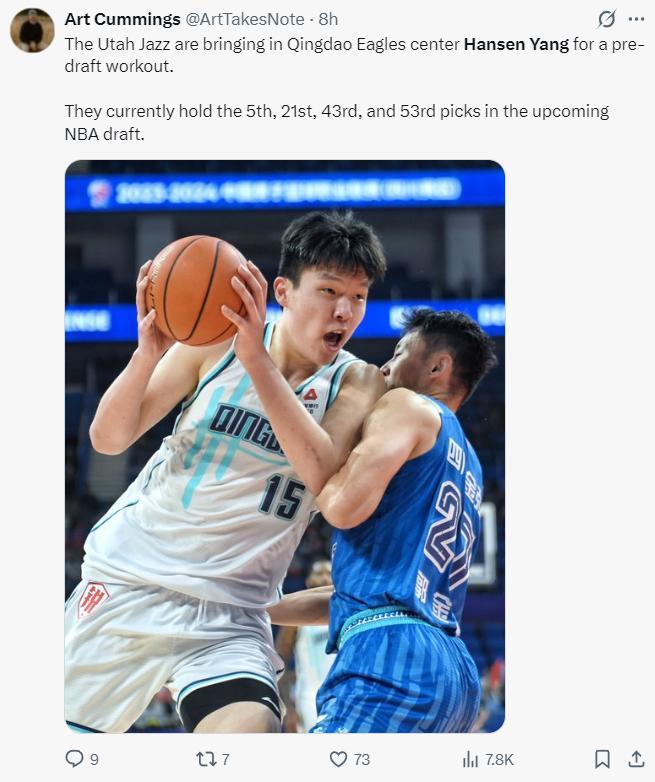 爵士記者Art Cummings透露,楊瀚森已經結束了爵士隊的試訓,爵士在2025年選秀大會上手握5號籤、21號籤、43號籤、53號籤。