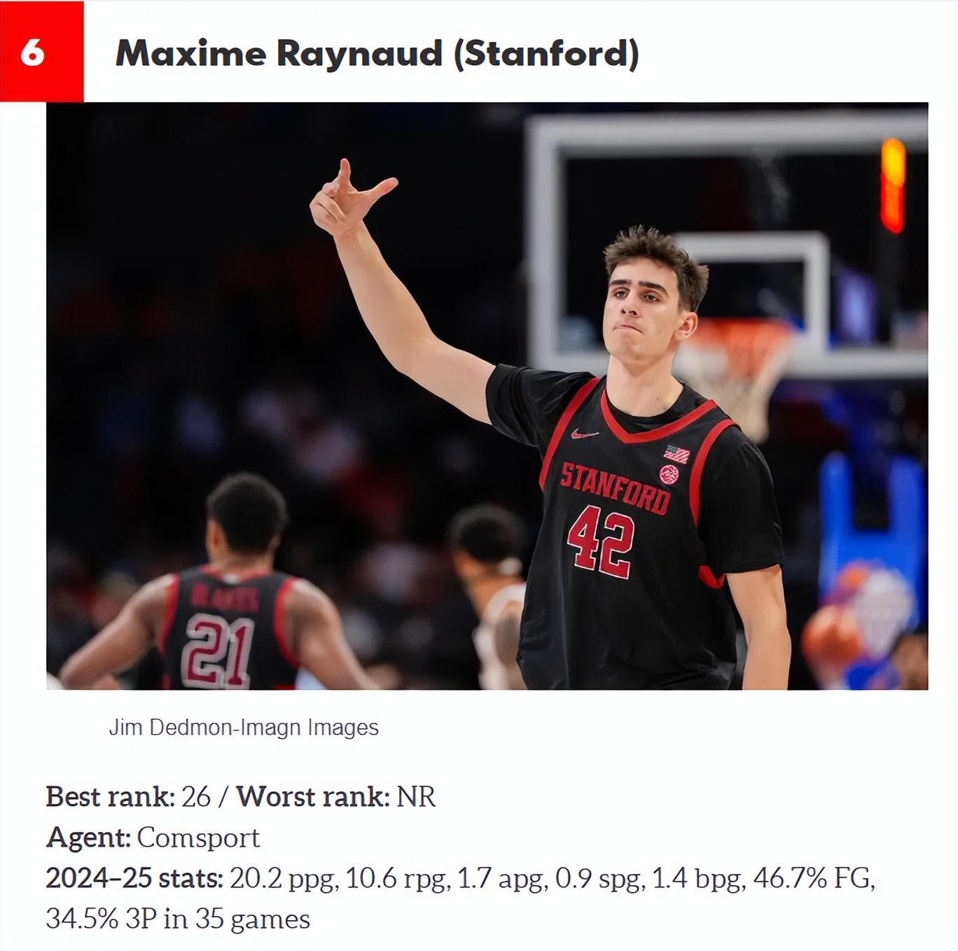 第六是馬克西姆-雷諾,他來自名校斯坦福,最佳順位26,最差是落選,本賽季場均20.2分10.6籃板1.4蓋帽,命中率46.7%,三分命中率34.5%。