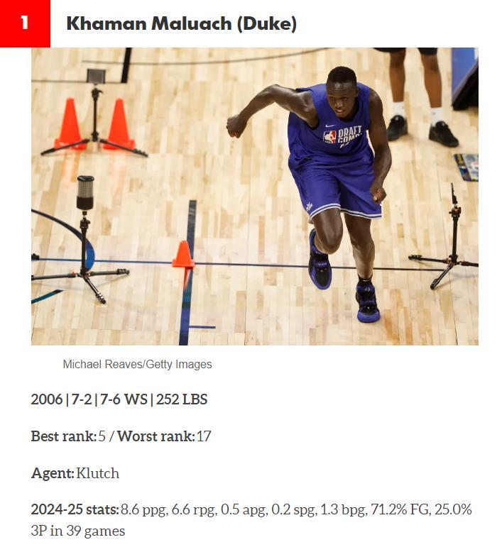 馬魯阿奇是毫無懸念的第一,預測最佳順位第五最差17,本賽季場均8.6分6.6籃板1.3蓋帽,命中率71.2%,這位身高7尺2+臂展7尺6的中鋒運動能力超強。他的經紀公司是Klutch,他跟楊瀚森一個經紀公司,在Klutch舉辦的Pro day試訓他與楊瀚森同組亮相。