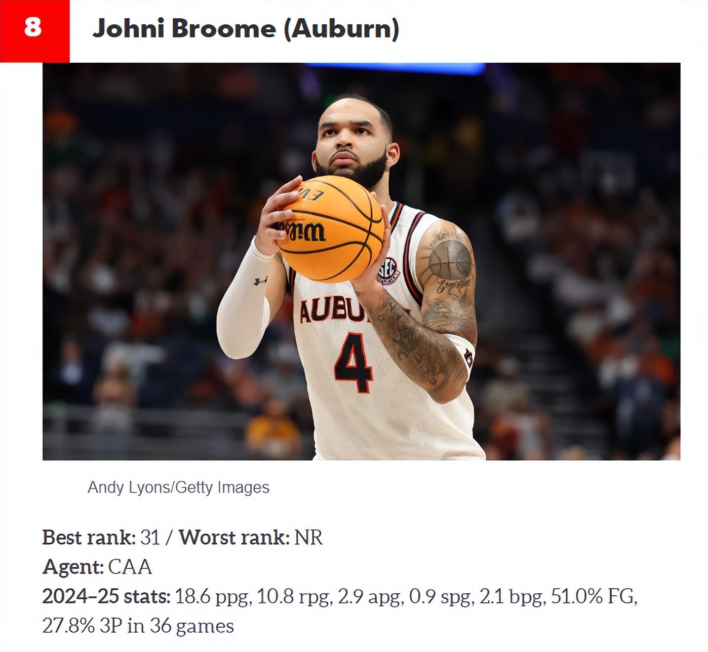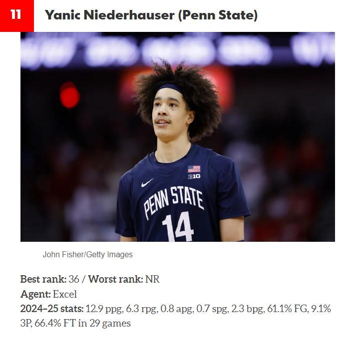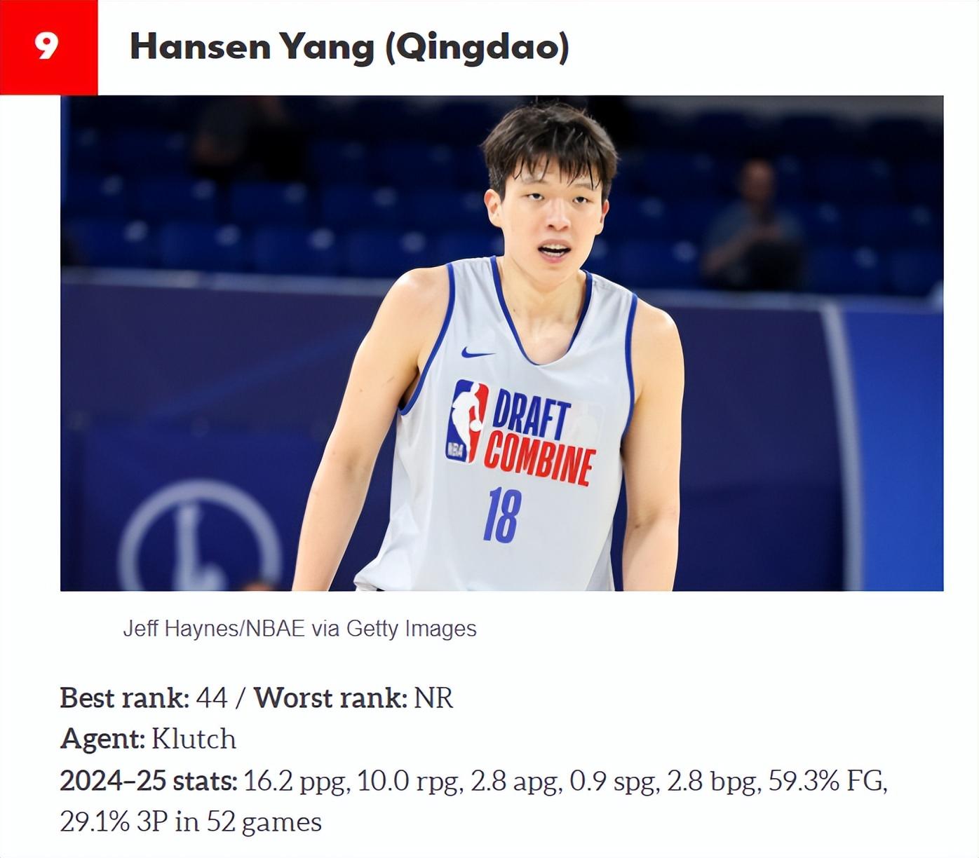 第九是楊瀚森,他的經紀公司也是Kluch跟馬魯阿奇一樣,雖然Hoops預測他還是次輪44,最差還是落選,但他已經進入最佳中鋒前十。(在克魯奇經紀公司給了楊瀚森巨大的扶持,在接連試訓開拓者與爵士後,楊瀚森的選秀行情還在提升)