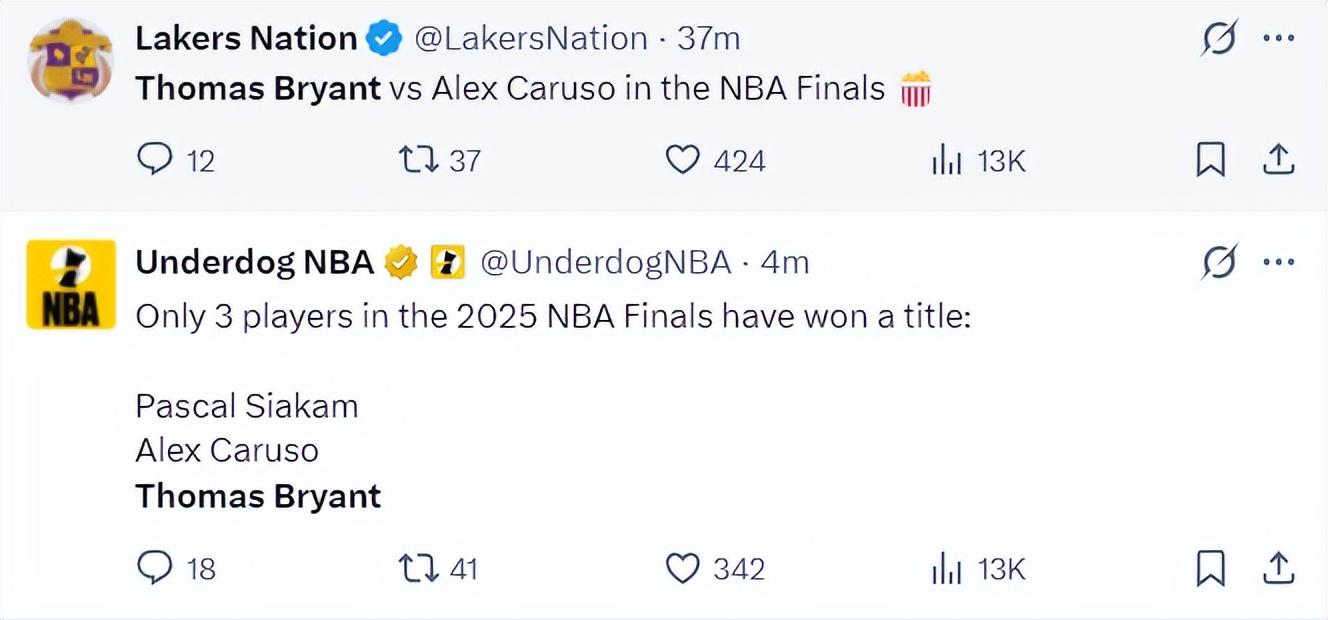 湖媒:兩位湖人舊將要在總決賽中相遇。美媒:這次總決賽只有卡魯索(2020年)、西卡(2019年)、託布(2023年)三人有總冠軍戒指。
