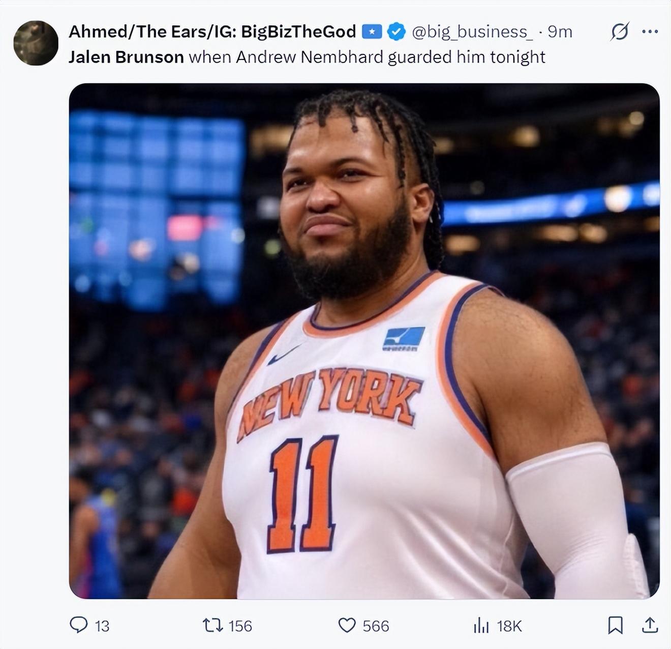 第二節布倫森出現了一個爭議時刻,他先是主動與內姆布哈德有身體接觸,隨後內姆布哈德貼着他,他與內少有推搡,結果裁判給了內少犯規,布倫森第二節被限制的很慘3中1+罰球2中1拿3分2助攻,整個上半場布倫森只有2個罰球。